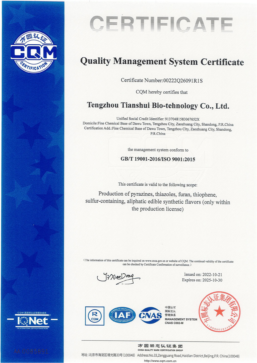滕州市天水生物科技有限公司成立于2011年9月,是目前國內雜環類合成食品香料、日化香料和醫藥中間體生產經營的綜合性企業。坐落于山東省滕州市生物醫藥產業基地,總投資5000余萬元,占地面積約30000平方米,員工百余人。公司先后被評為高新技術企業、專精特新中小企業、科技型中小企業,建有市級重點實驗室1處,并先后獲得ISO9001質量體系認證、ISO22000食品安全體系認證、kosher認證和Halal認證。是香精香料及食品配料協會會員單位及滕州市中小企業協會理事單位。
